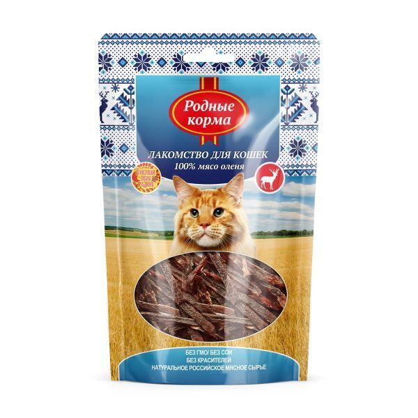 Вяленые лакомства Родные корма предназначены для поощрения кошек и выработки у них благоприятного поведения. Нежную соломку, изготовленную из оленины, можно использовать как лакомство, а также добавлять в основной корм. Произведено только из свежего натурального 100% мяса без добавления красителей и консервантов. Лакомство понравится даже самым привередливым кошкам.